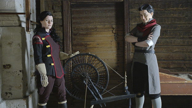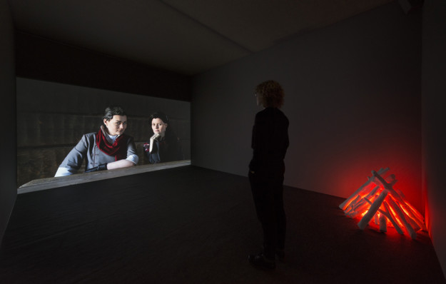 Throughout the exhibition, there is a predominant sensation of a gliding movement in time – between a past that is somehow still present and a future that already lurks in our consciousness. In one of Annika Eriksson’s most recent videos, Past Lives Selector (2016), we encounter two cosplayers that were commissioned by the artist to create personas in relation to an open-air history museum. Though they are both dressed in historical costumes, they appear oddly futuristic – like two medieval cyborgs.