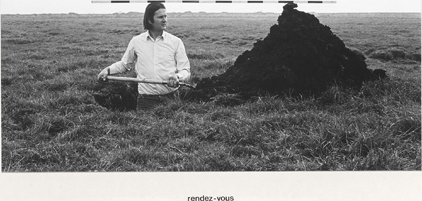 A series of photographs, in the format of visual poems, shows the spectator Sigurdur Gudmundsson in an absurd situation. Gudmundsson has said that his art has largely centred on exploring what is unknown to him . Perhaps this can explain his digging in sand next to a stack of books in Structures (1977), his search for balance in Composition (Study) (1978) and Dialogue (1979), or his looking/hiding under a paving stone in Event (1975). The “Situations” are often about searching, but maybe also about longing away. And despite being occasionally comical, the images convey a distinct gravity when shown together as they are here. Absurdity and occasional comedy shift into a mood of melancholy and a flight from life on earth as we know it.