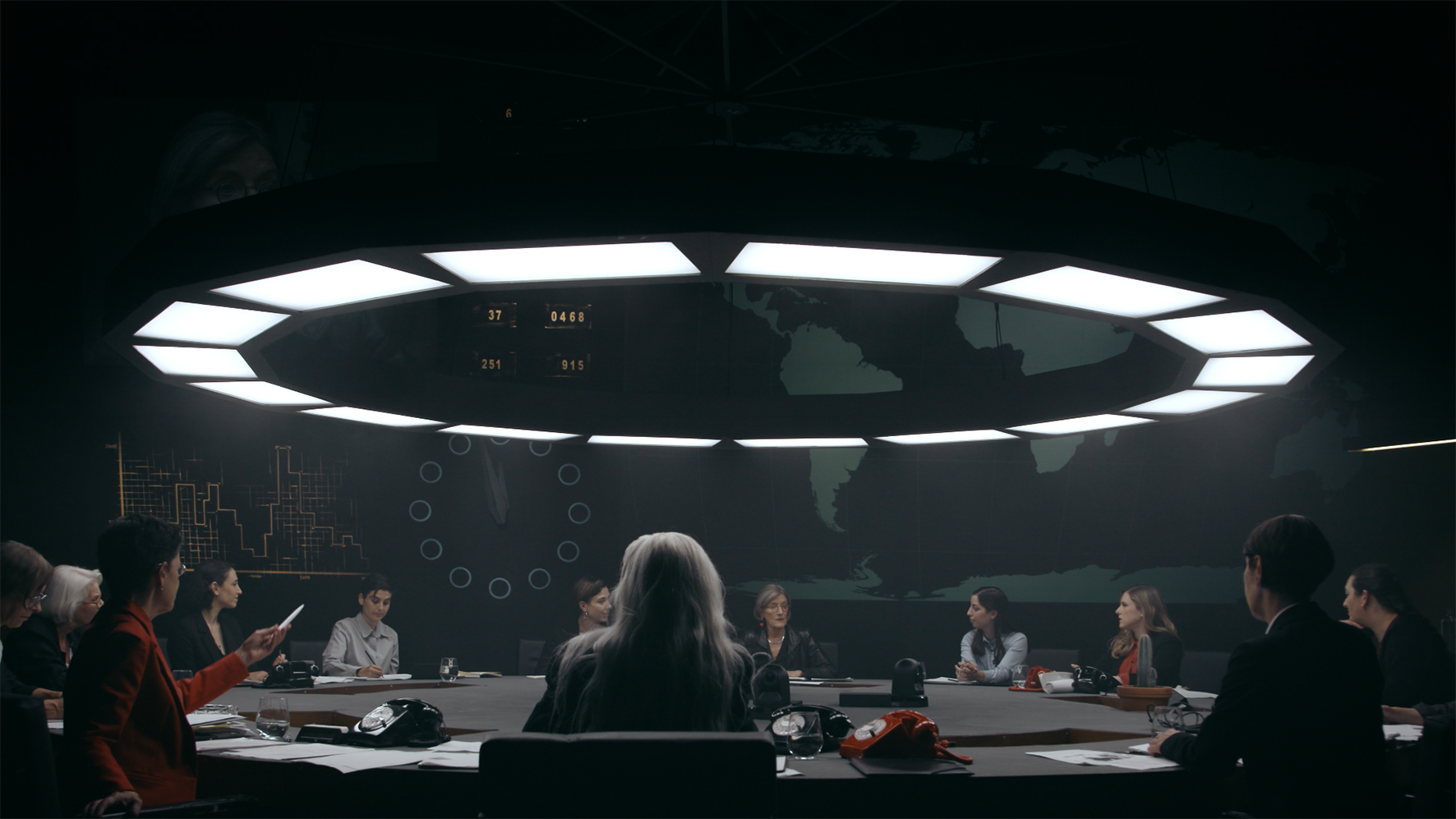Yael Bartana made her first extensive solo exhibition with Moderna Museet Malmö in 2010. For Twilight Land she returns to the museum with Two Minutes to Midnight. In the film we encounter the entirely female government of an imaginary nation. To deal with an increasing threat from a hostile nuclear power, the female government gathers in its “peace room” – as opposed to Dr. Strangelove’s toxically masculine “war room” in Stanley Kubrick’s classic Cold-War satire.