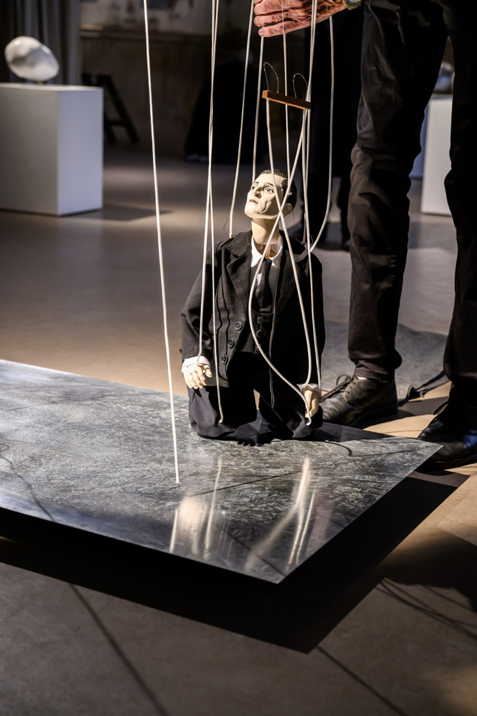 är ett stumt samspel mellan en stor tråddocka, skådespelaren och de två musikerna. I scenen ingår skulpturen ”Kordofon 9”.