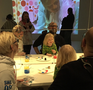 Med ätbara färger gjorda av gurkmeja, rödbeta och växtgrönt kommer de allra minsta besökarna och deras vuxna sällskap att kunna göra en gigantisk golvmålning. De lite äldre kommer att kunna actionmåla sina ansikten, splasha färgpåsar med dartpilar, eller med hjälp av slumpen och gravitationen skapa en stor droppmålning. I aktiviteten som bär samma namn som utställningen, Actionpaintingbabysplash!, kommer en kaskad av färger och besökarnas egna kroppar att transformera de vita museiväggarna till en gigantisk rumsmålning. Alla aktiviteter gör vi tillsammans, både vuxna och barn, och det går förstås bra att komma även utan barn i sällskap. Så leta fram oömma kläder och bered dig på att bli kladdig.