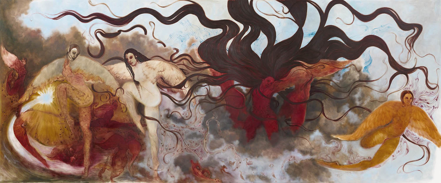 Allegory – long tied to shared iconographies from myth, religion and history – is today resurfacing in areas such as autofiction, mysticism, astrology, esotericism and science fiction. Invoking the Mesopotamian goddess of writing, “House of Nisaba” transforms the gallery into an immersive space where newly produced paintings make allegory a vital form for our divided contemporary world.
