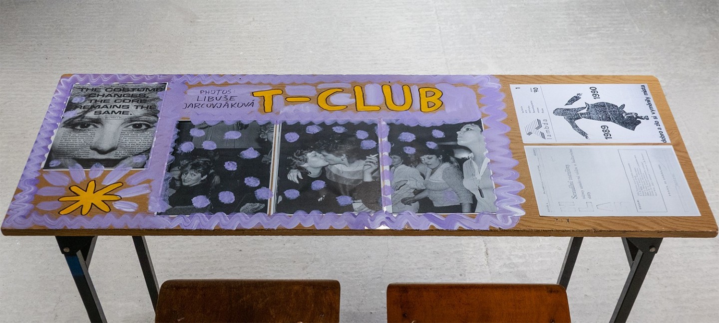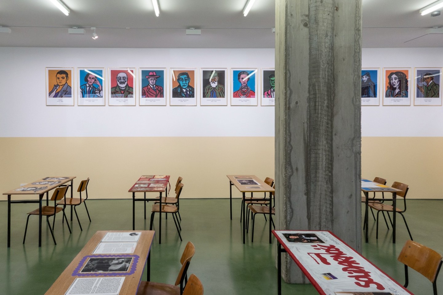 The chairs, benches and concrete are familiar to most who were students or teachers during that period, and perhaps especially in Central and Eastern Europe. At the same time, the everyday school environment reflects something different from the curriculum one might expect there: hidden queer stories and iconic queer figures who have been banned are integrated into the classroom’s interior and educational materials.