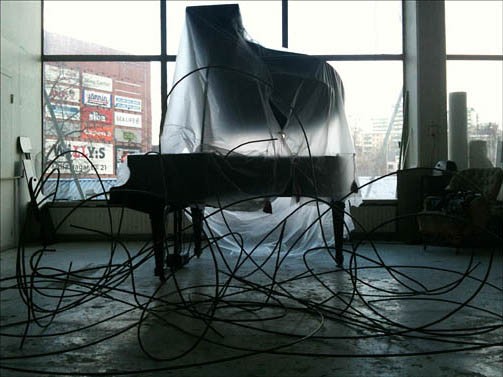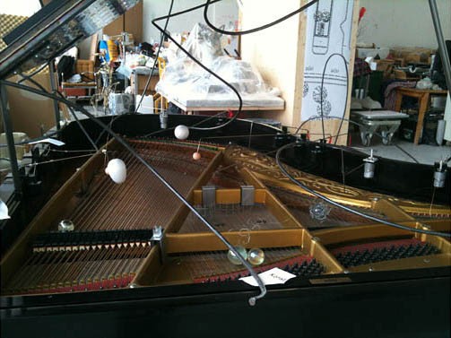 Two grand pianos are at the core of this work, both musically and visually. The grand piano is an instrument laden with prestige and tradition, in stark contrast to the light-hearted game in which it is engaged here. As if drawing in space, externalising the motion of the notes, long sculptural metal feelers extend from and around the grand piano. The objects extract new notes from the piano and contribute to drawing the audience into the instrument. The sound enveloping the visitors in the room takes place on several levels. They all originate in the grand piano. It is an intricate technique, where electronically-processed audio is mixed with mechanically produced sounds in a specially-composed piece that will be heard constantly in the room throughout this period. During the concerts, which take place on several occasions, a purely human level is added when Eva Sidén plays, and relates to, the prepared grand piano as a physical object.