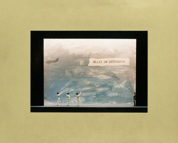 The photographic series Skizzen zum Projekt Grosses Theater (1980) consisting of stiff action figures against painted backdrops is the earliest work in the exhibition. In one of the scenes, three Star Wars princesses appear under a banner with the Latin words “Pro Status Quo”, a famous phrase that has been interpreted in a variety of ways in history; the literal translation is “For that which is”. Opposite them, Mr Spock from Star Trek raises his right arm. In another picture, the Leia princesses are waving at an aeroplane with a banner reading “Alles in Ordnung”. When we look at these miniature sci-fi characters against their backdrops, however, life seems to be anything but orderly.
