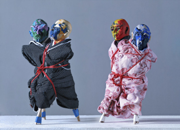 Schütte often works serially. Over the years, he has built a repertoire of motifs, shapes and themes that he revisits, develops and adapts to different dimensions or unexpected materials. The large sculptures United Enemies (2011) are based on a series of eponymous works on a considerably smaller scale that he began making in 1992. These small three-legged figures were dressed in fabric and tied together two and two before being placed under bell jars on plinths. The figures are each other’s prisoners – united enemies. In 2011, nearly twenty years later, when Thomas Schütte returned to this motif, he enlarged the “enemies” to larger than life size. The figures in the new series have got down from their pedestals and turned into grotesque giants cast in one of the most tradition-laden materials in art history – bronze.