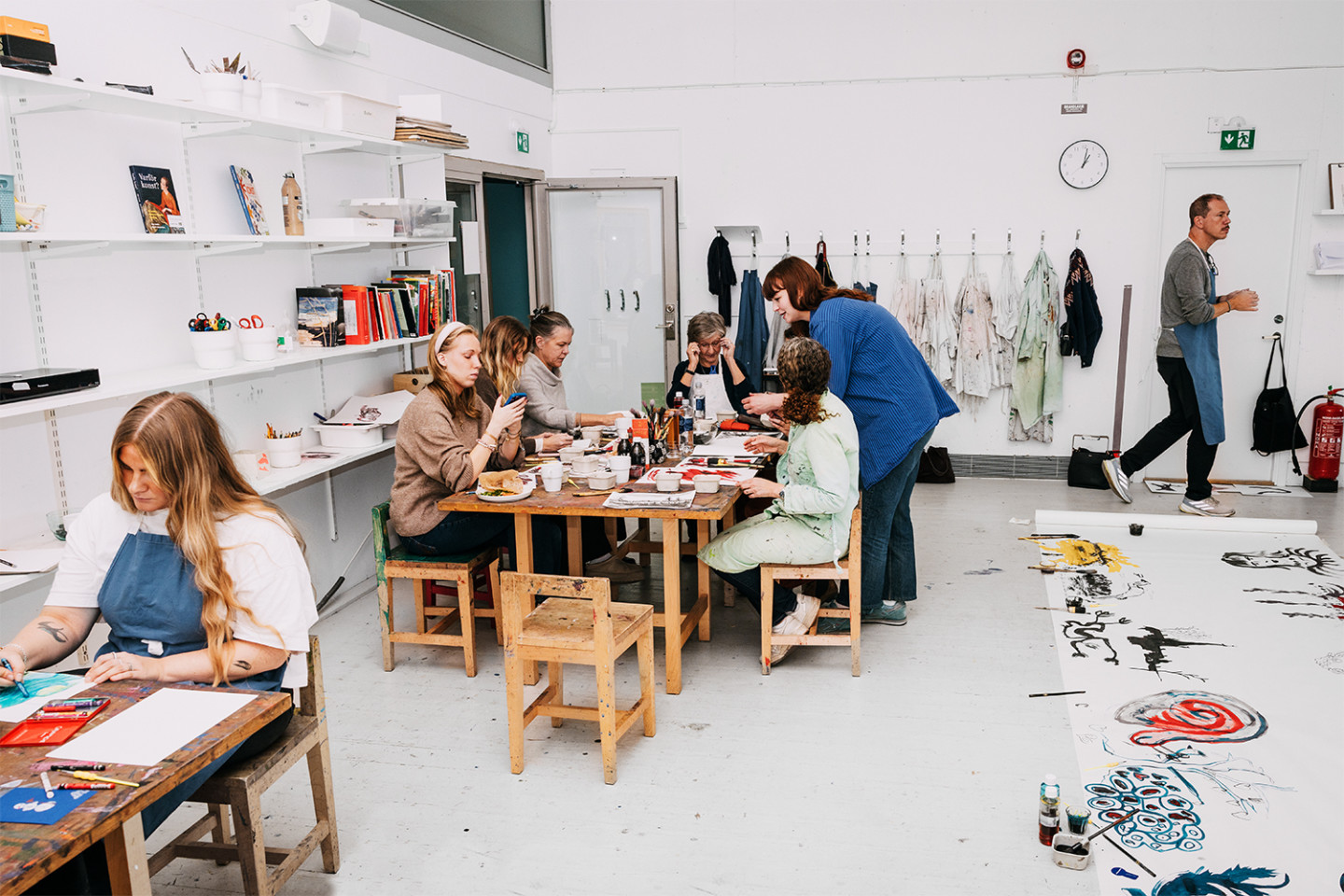 I workshopen utforskar vi olika material och uttryck och prövar hur en linje kan bli en berättelse. Genom både snabba, spontana tekniker och mer genomarbetade uttryck får eleverna reflektera över hur teckning kan hjälpa oss att förstå och förändra världen.